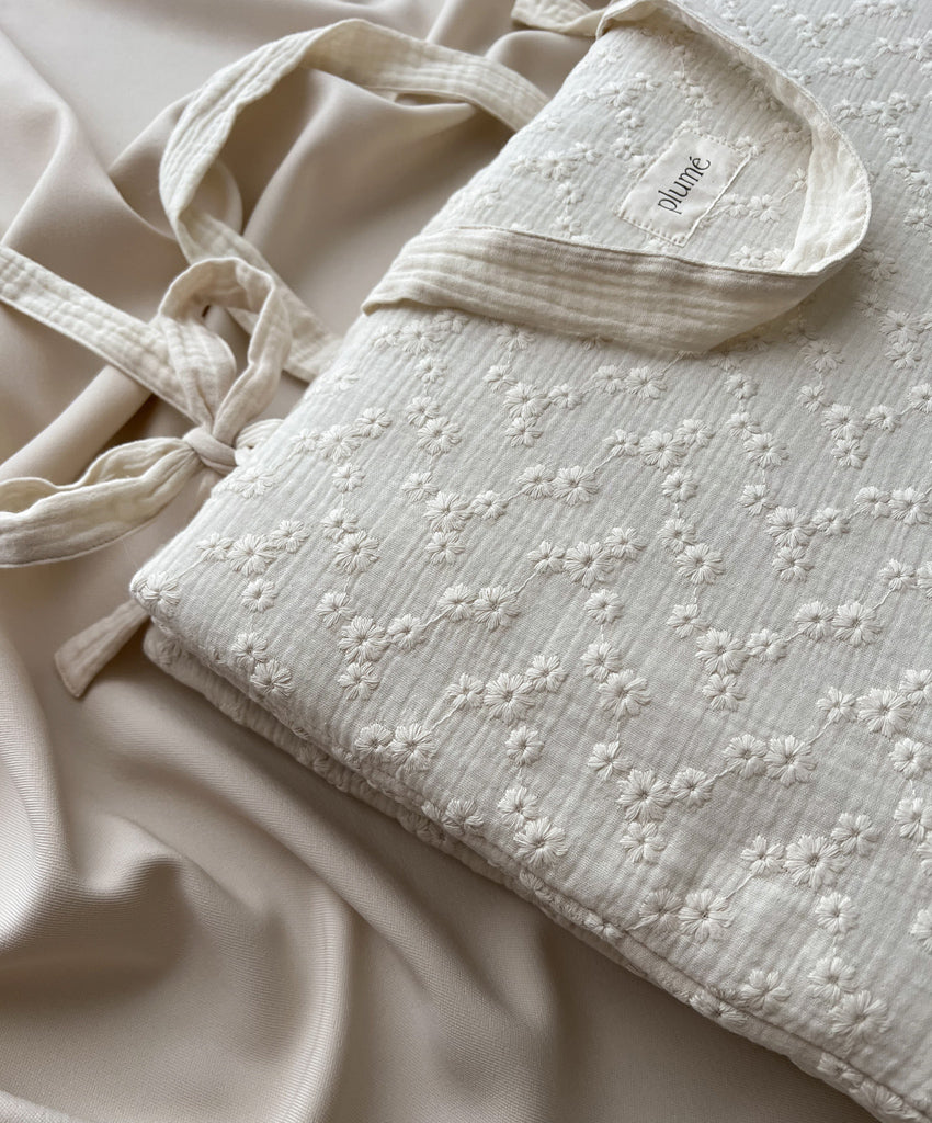 We recommend washing our products on a delicate cycle at 30ºC. We recommend ironing muslin diapers and wraps at low temperature.
